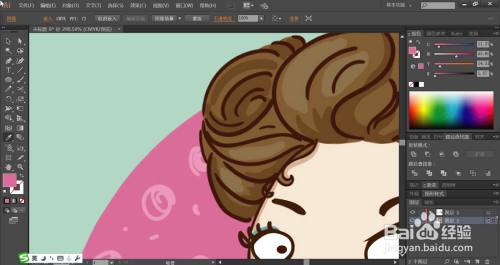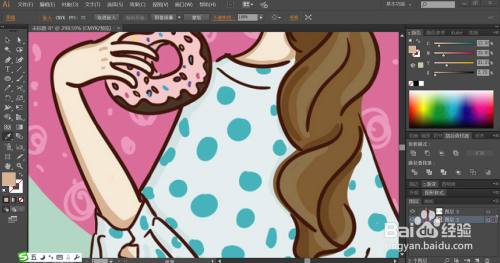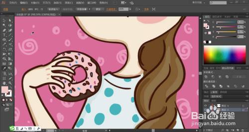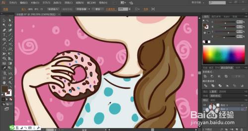 这一步,我们使用钢笔画出女孩手里的甜甜圈的路径,再用桃红色与灰褐色搭配分别填充甜甜圈的表面与主体,上面的各种点缀使用蓝色、粉红色、灰褐色来填充。