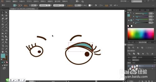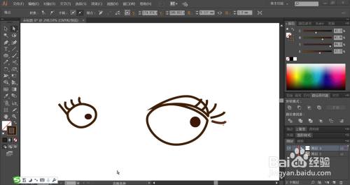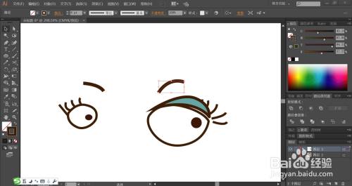 使用咖啡色描边线条路径,再用白色填充眼晴,瞳孔所在的圆形路径使用咖啡色填充,右侧眼晴的眼帘使用蓝灰色填充。眉毛也使用咖啡色描边呈现,在线条比例上更粗一些。