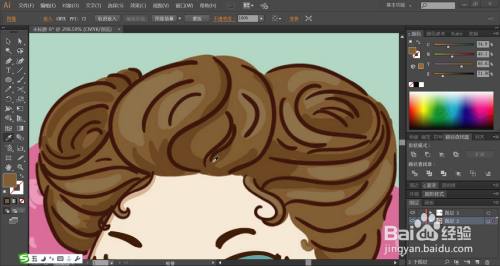 继续使用钢笔工具画出头发的整体路径,再画出高光与暗光的线条路径,我们用灰褐色填充头发,再用半透明的白色填充高光,使用咖啡色对于暗光的线条进行描边。