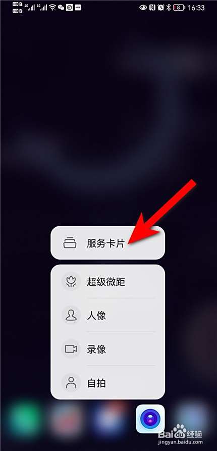打开手机,长按手机应用,页面弹出选项,点击服务卡片。