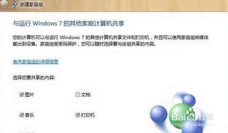 在“家庭组”窗口中点击“创建家庭组”,勾选要共享的项目。Win7家庭组可以共享的内容很丰富,包括文档、音乐、图片、打印机等,几乎覆盖了电脑中的所有文件。