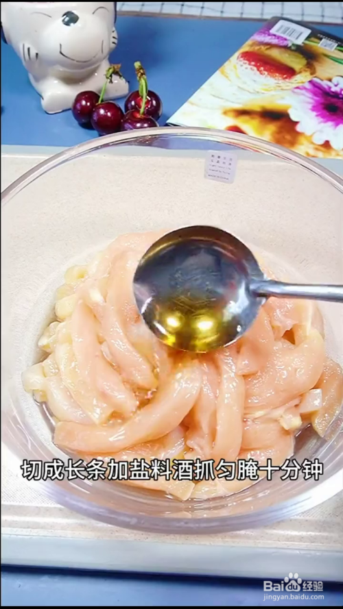 我们将鸡胸肉切条,加入盐和料酒腌制十分钟,去除腥味