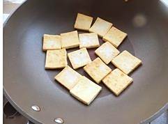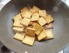 加入五香粉、孜然粉,倒入煎好的豆腐干。