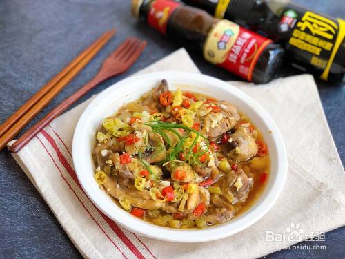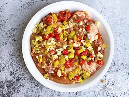 腌制好的鸡肉从冰箱里拿出来,上面均匀铺上小米辣,剁椒和蒜泥。