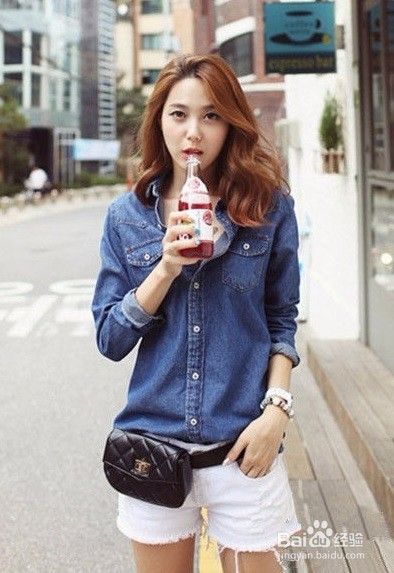 搭配二:长袖牛仔衬衫+白色短裤