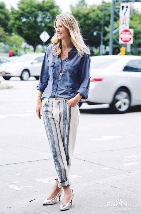 搭配三:长袖牛仔衬衫+蓝白条纹休闲裤