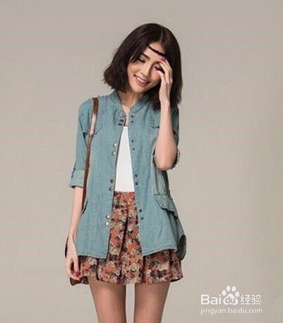 搭配五:长袖牛仔衬衫+白色T恤+花苞短裙