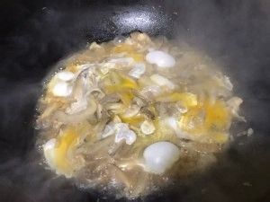这个时候加鸡蛋,鸡蛋直接打破一个小洞,均匀甩到蘑菇上,让鸡蛋裹住蘑菇。不要急着翻动,待鸡蛋慢慢凝固。