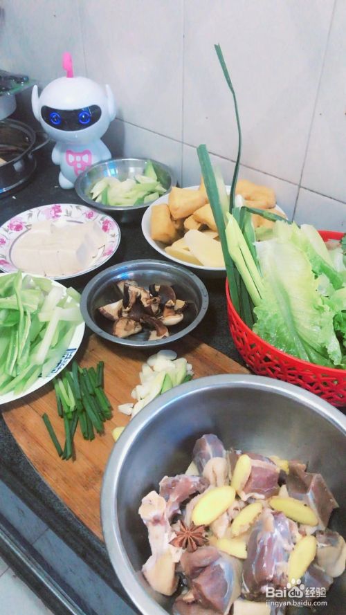 准备材料:鸭、土豆、洋葱、豆腐、芹菜、青椒、豆泡、芹菜、香菇、香菜、小葱;