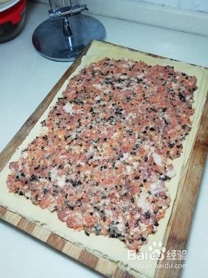 将肉馅均匀平铺到豆腐皮上,尽量越薄越好
