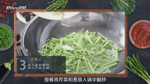 将芹菜和葱放入锅中翻炒,加少许食醋翻炒。