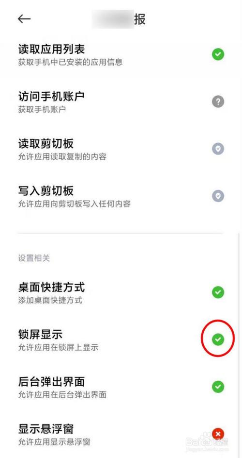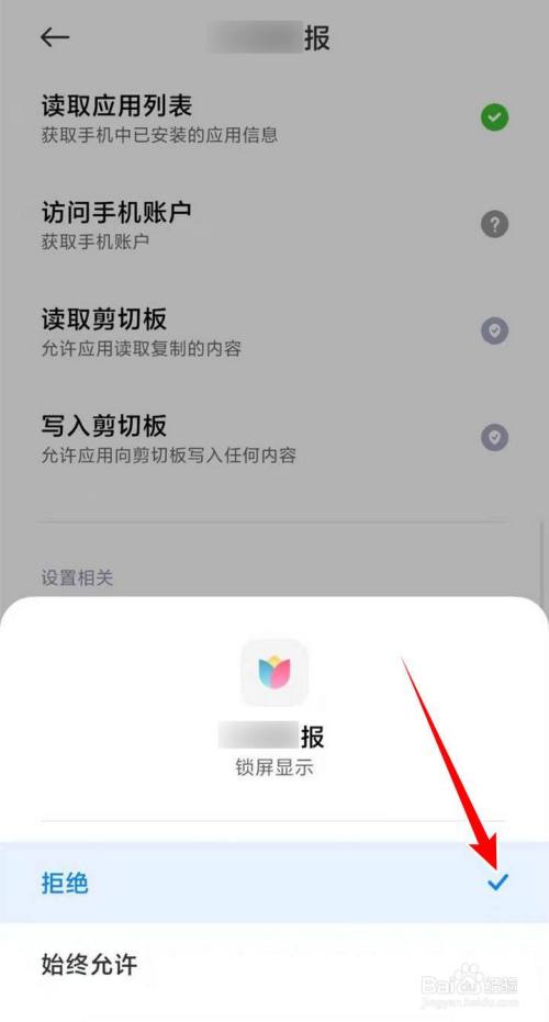 进入权限页面,点击锁屏显示后的√,进入选项窗口,点击拒绝即可取消锁屏花朵;