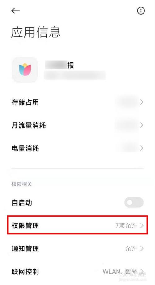 进入应用管理页面,点击搜素框,搜索画报,进入应用信息页面,点击权限管理;