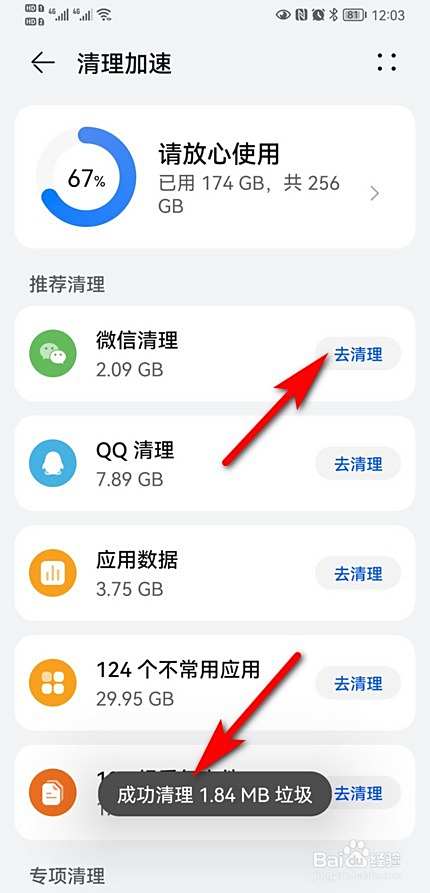 页面弹出成功清理,依次点击其它项目后面的去清理,清理完就不会弹出提示了。