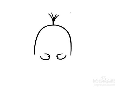 第1步,小孩整个身体是一个大大的椭圆形,我们先画一半椭圆来表示他的上半身,并且把她头顶上的那几根头发也画出来,