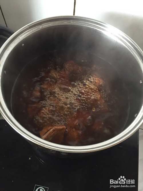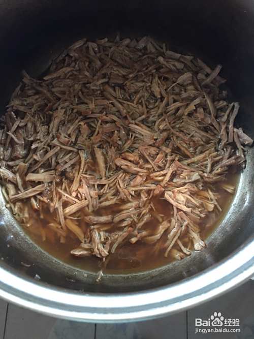 高压锅里大概20分钟左右吧,排完气后把肉另外乘在一个锅子里,加入刚才的卤水,不用全放,和肉块平就好了,然后放点点盐和白糖调味,按照自己口味来,喜欢辣的可以放点干辣椒,继续煮一会,这时候肉块应该是很烂的了,可以用筷子把肉块弄碎一点,这样可以充分入味