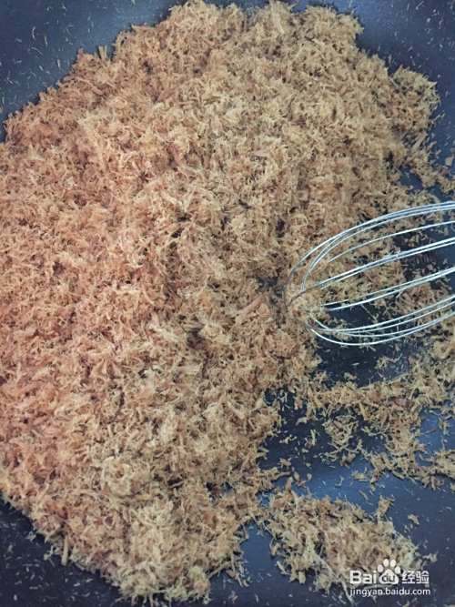 炒锅里加入一点油,放入搅好的肉松翻炒,主要是让肉松收干水分,小火不停翻炒,几下后用打蛋器翻炒,可以让肉松更蓬松一点,小心炒焦了啊