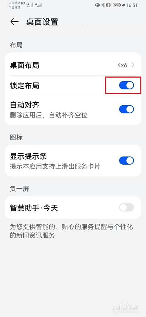 在华为手机上,通过桌面和壁纸的桌面设置,关闭锁定布局设置开关的方法。