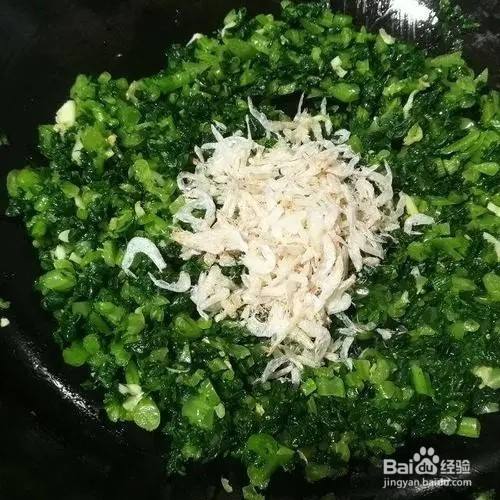 锅内倒入少许油,放入葱花炒香,放入虾皮煸炒至微黄后放入萝卜缨子煸炒2分钟。
