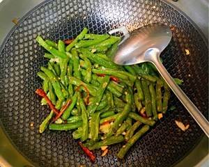 起锅烧油,油热爆花椒,炒葱姜蒜辣椒,后加入四季豆翻炒,出锅!