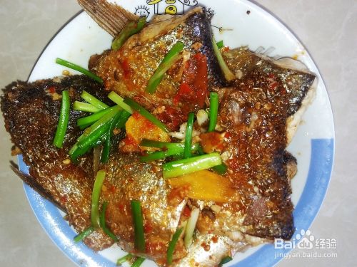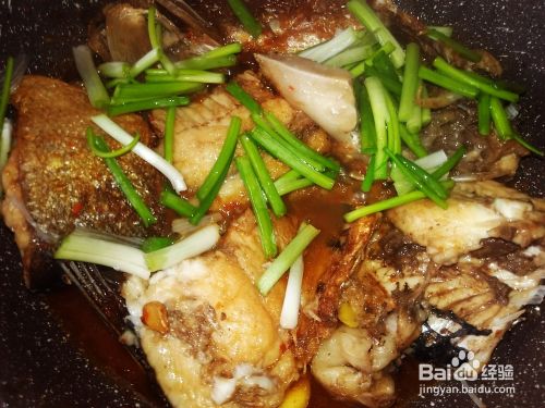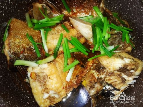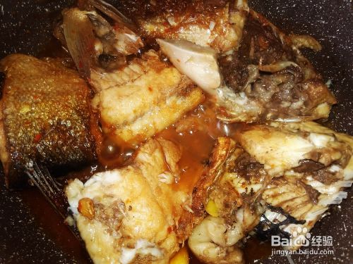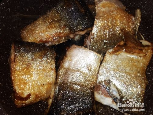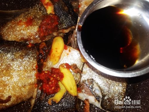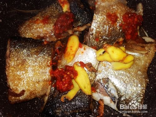 煎至鱼块两面金黄色,然后放1勺辣椒酱、适量姜片进去。