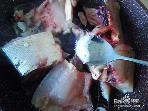 热锅下油,把鱼块摆到锅里,撒适量的盐花用小火煎。