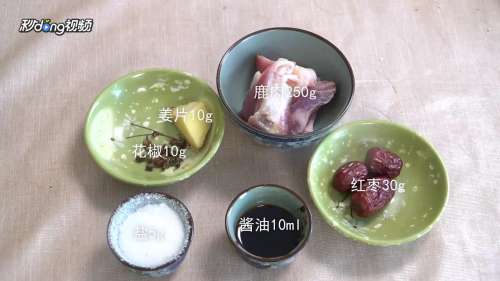 1准备鹿肉250 克,红枣30克,酱油10ml,姜片10克,花椒10克,盐5克。