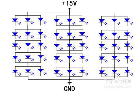 LED灯板上的单颗LED灯珠电压使用范围在3.0V~3.5V,功率约为0.5W。外部供电电源电压使用15V24W以上电源。在原来的布线基础上,设计新的LED组合方式为3*5为一组,然后使用其中3组并联起来符合外部电源功率要求: