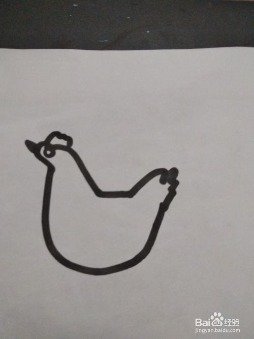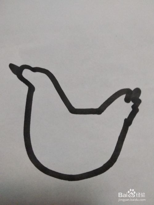 先画出母鸡的上半部分身体轮廓线。再补齐母鸡的其他身体轮廓线。注意母鸡的下半部分身体轮廓线一定要圆滑流畅。
