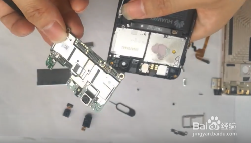用手指拨开主板,即可更换电池、前置摄像头、后置摄像头和其他原件