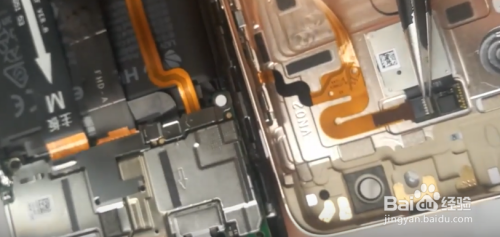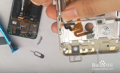 撬开后盖后,再用螺丝刀拨开指纹识别模块的排线盖,吹风机加热排线溶胶后,即可拆除排线
