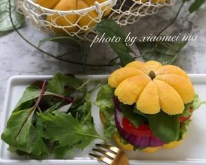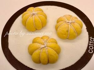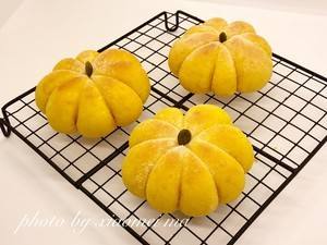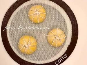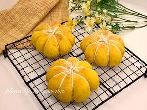 出炉后稍微放凉,轻轻剪开绳子,向8个方向打开。 南瓜味因为加入南瓜,面筋变弱,支撑力也变弱,会是扁一点的南瓜。烤好的面包很轻。