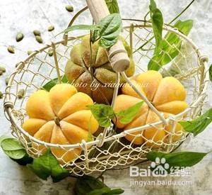 以南瓜味为例: 黄油室温软化,如果有面包机用面包机和面;没有的话,面包所有材料放在一起,揉成均匀的面团,不需要揉出面筋。一次发酵后排气,分成6等份成型。面包筛上薄薄的面粉,线绳也沾好面粉,松松地把线绳绑在面包上,这个时候要把线绳摆正,间隔适中,不然发酵后南瓜的形状就歪掉了。 不要绑紧了,不掉就可以。太紧了二发时绳子会勒进面包里