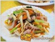 1用料;瘦肉丝100克(买现成的),胡萝卜一个, 茶干100克,洋葱半个,秀珍菇100克,芹菜100克.