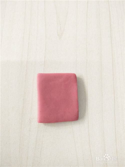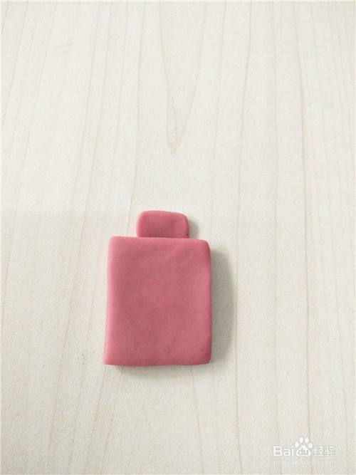 再用一小块粉色彩泥捏一个小的长方形,粘在大长方形上方,当作后面的领子。