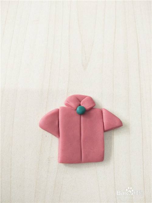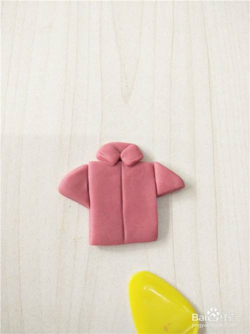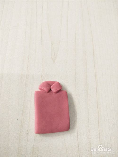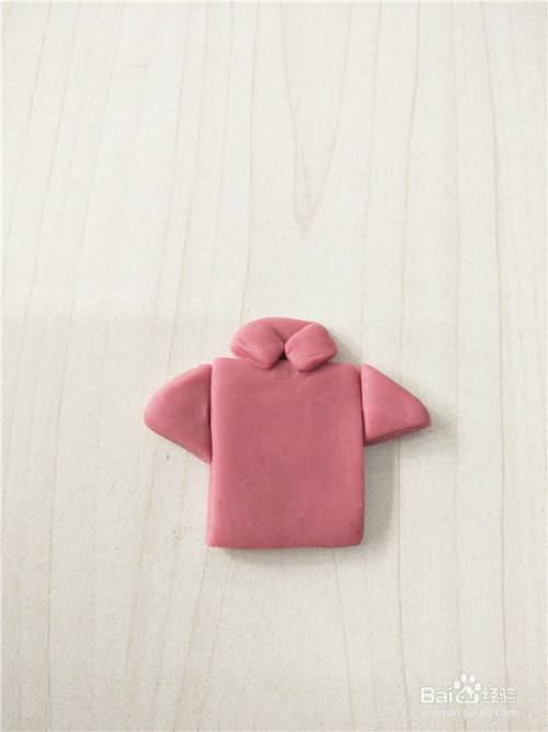 用两块一样大的粉色彩泥捏两个三角形,粘在大长方形的两侧,当作两只袖子。