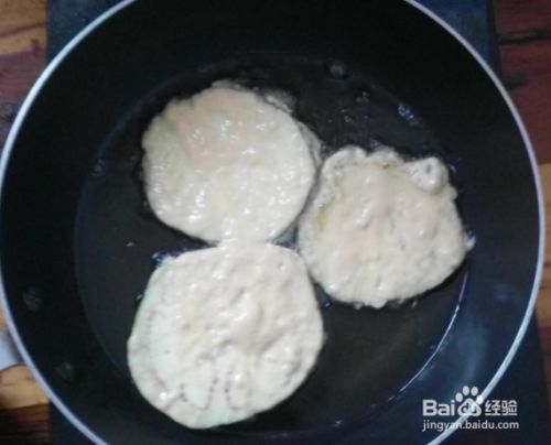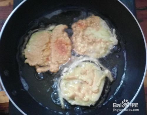 第五步,油加热以后,将裹好面糊的茄子片从锅边上轻轻滑入锅里,不要用力往里扔,以免油溅出来烫伤。