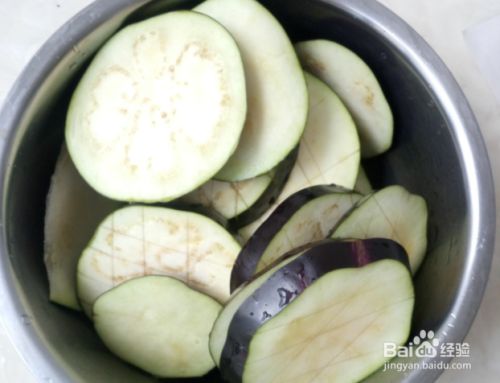 第一步,把茄子洗干净,切成片,为半指薄厚即可,然后泡在水里一分钟,然后放到碗里备用。