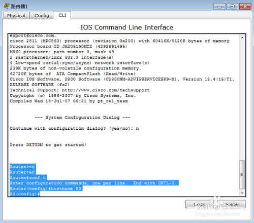 Router(config)#hostname R0 配置路由器的名字:R0