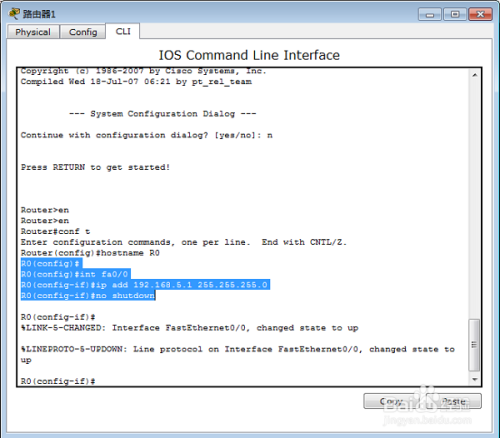 R0(config-if)#ip address 192.168.1.1 255.255.255.0 赋予 IP地址