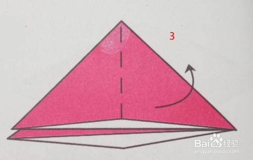 第四步:背面也折法同3.(沿虚线按图示从下面撑开压折)。如下图所示