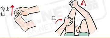 4、小腿或者脚趾抽筋:用抽筋小腿对侧的手,握住抽筋腿的脚趾,用力向上拉。同时用同侧的手掌压在抽筋小腿的膝盖上,帮助小腿伸直。
