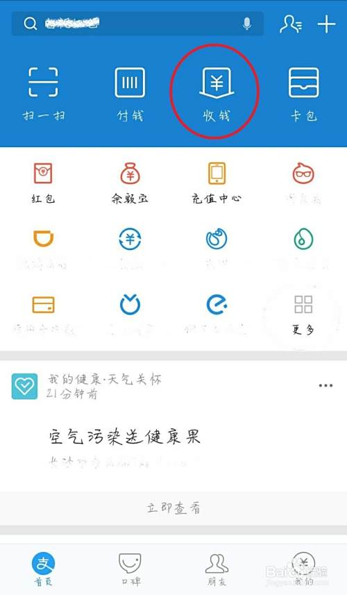 首先,打开支付宝首页,点击上面的“收钱”(如图);