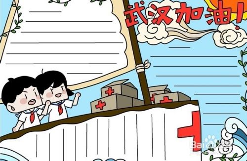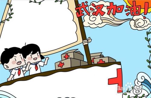 首先在右上角画上报头文字“武汉加油”,底部画上一层层浪花,上面画一个船的形状,左边画上两个小朋友。