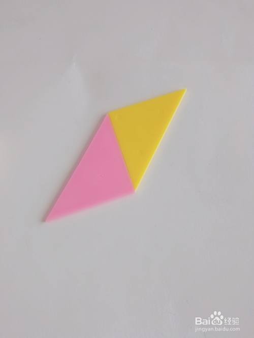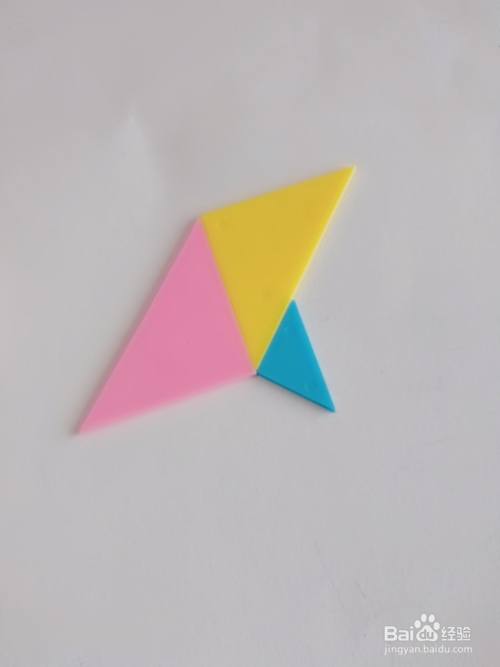 拿出一块黄色大号的三角形板与粉色大号板靠在一起,如图所示。