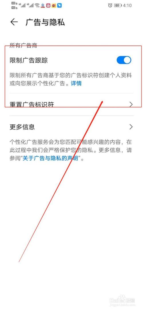 点开“广告与隐私”,在该界面找到“限制广告跟踪”,将其后边的开关条打开即可。如图