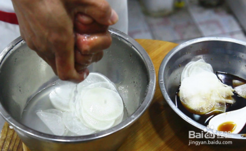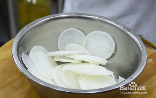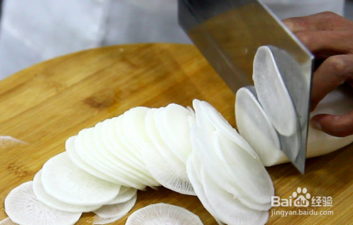 首先,我们把萝卜削去外皮,切成均匀薄片,我们用的是水果萝卜,口感更加的清甜,当然本地的青萝卜更有味。