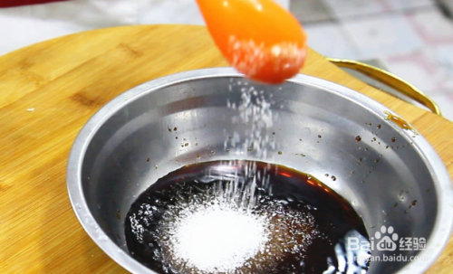 接着,我们调一个腌料:因为是糖醋味的,这里白糖和白醋都要多放一些,口感才酸甜,碗中放入生抽15克、陈醋10克、白糖10克、再加一点食盐增加底味,搅拌均匀备用。