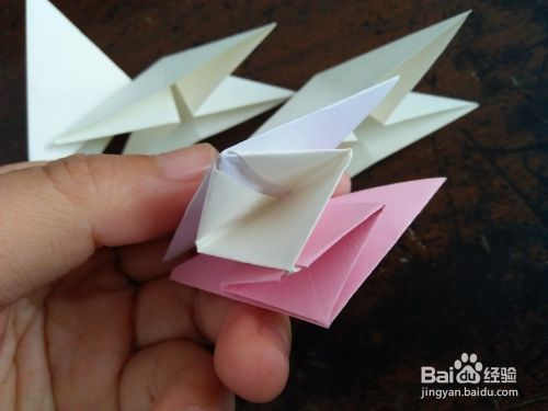 我们接着用其他的彩纸按照上边的步骤依次折好,我们继续把两个折好的彩纸插在一起,如图二。