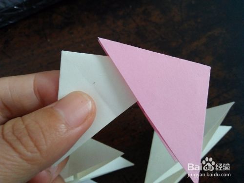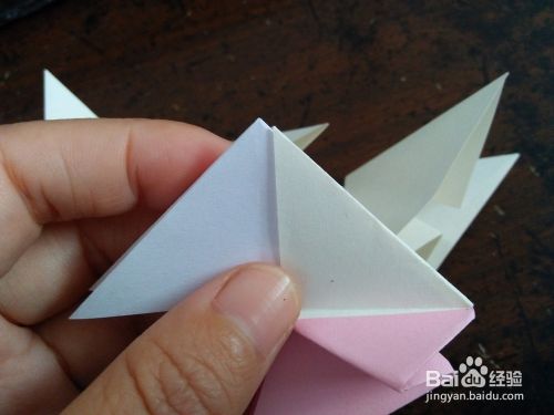 把手指插进折好的彩之中间的缝隙里撑开,并且压平。接着我们再接着插第三张折好的彩纸。